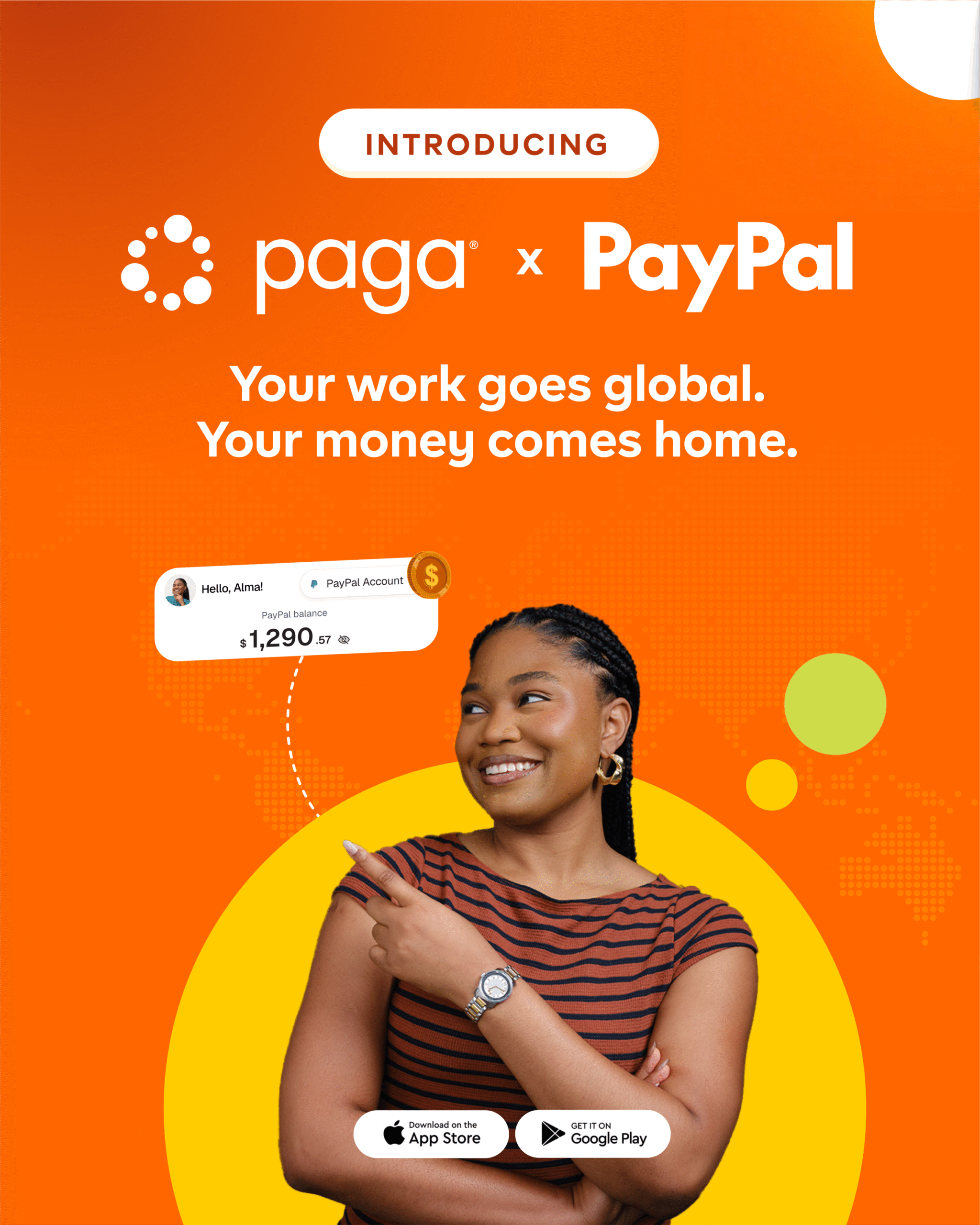 To access PayPal services through Paga, users  can log in to the Paga app or  www.paga.com, link their PayPal account, and  start receiving international payments into their Paga wallet and use those funds to pay bills, transfer to bank accounts, or shop online.