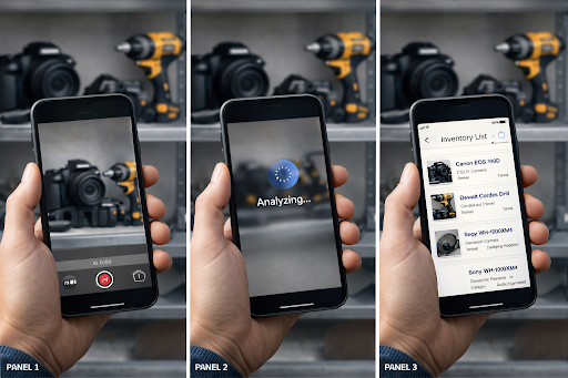 Some of these AI-powered systems flip this entirely. Every item in your inventory includes photos automatically extracted during the cataloging process, creating a visual catalog that works like your phone’s photo library. Scroll through the equipment and instantly spot the camera with the scratched body or the projector with the blue case.