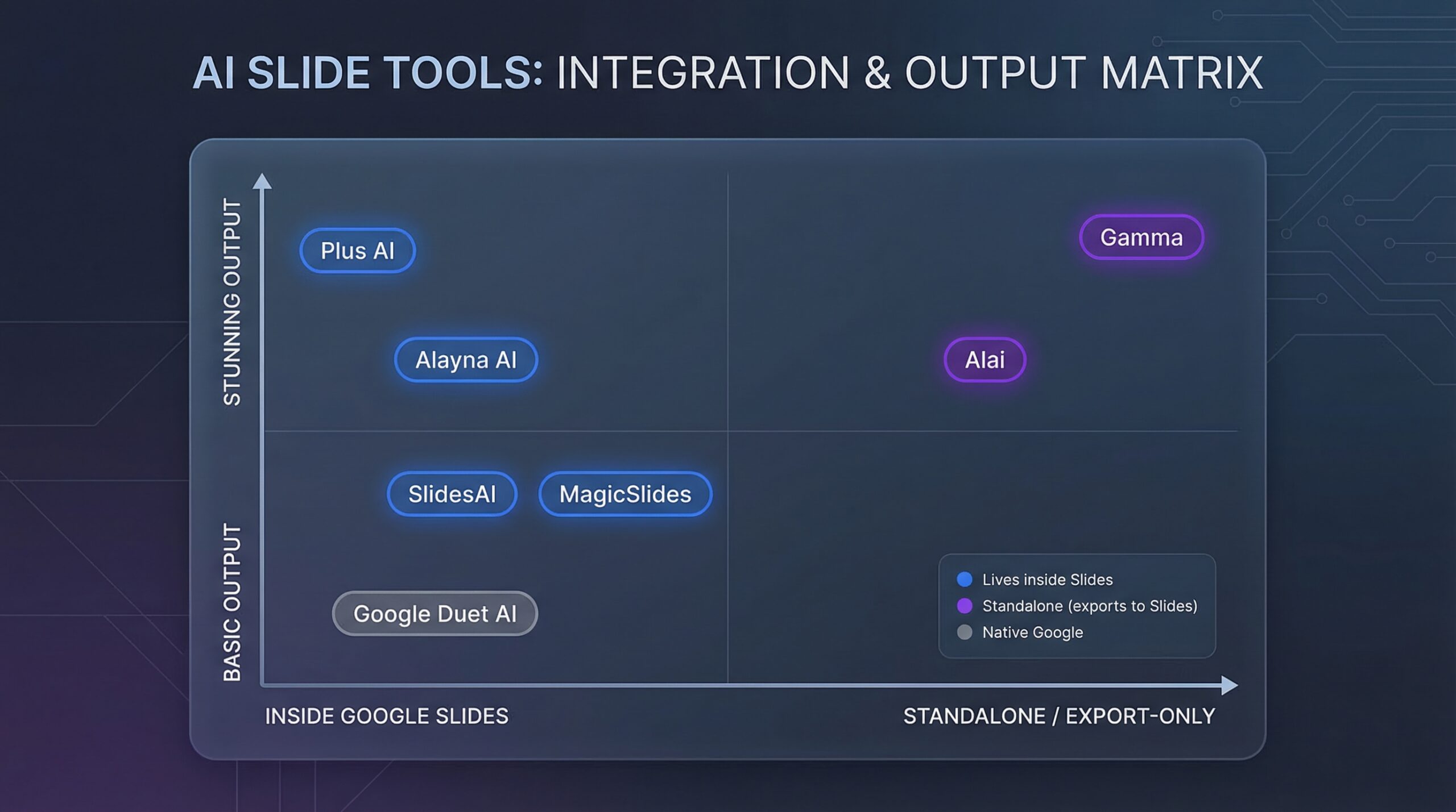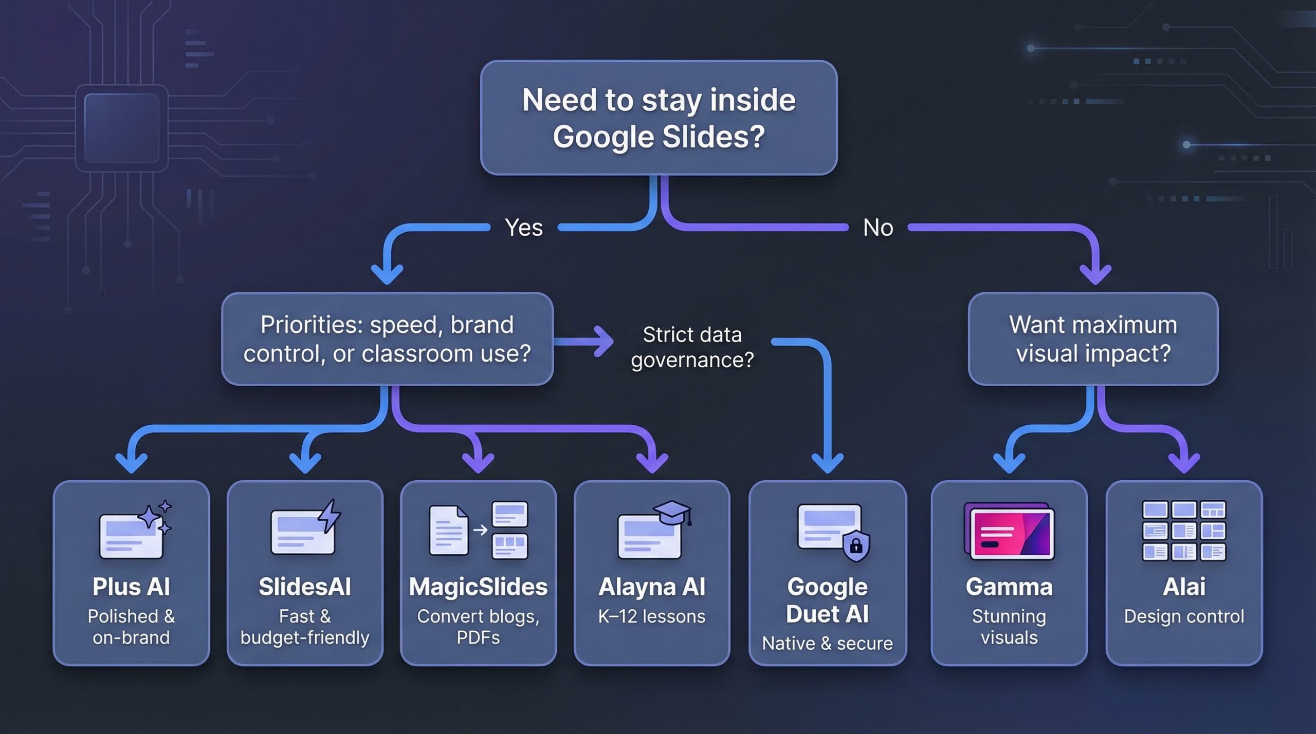 If the answer is yes, focus on Plus AI, SlidesAI, MagicSlides, or Alayna AI. Plus AI excels in polish and brand control, SlidesAI wins on cost and speed, MagicSlides converts rich source files, and Alayna targets K-12 lessons.